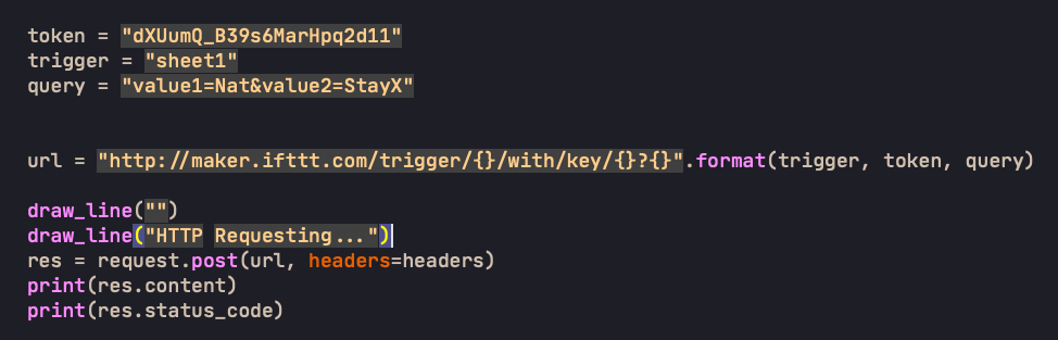 หลังจากนั้น Copy Token มาใส่ในโปรแกรมของเรา โดยแก้ token, trigger และ query สำหรับการส่งข้อมูลเข้า Spreadsheet ของเราครับ