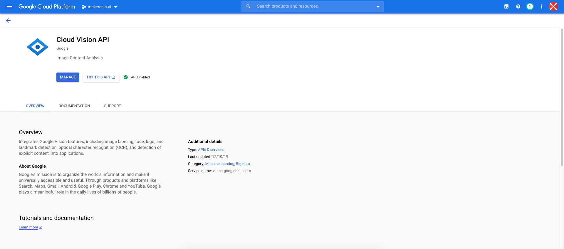 และตรวจสอบการเปิดใช้งาน Library Cloud Vision API