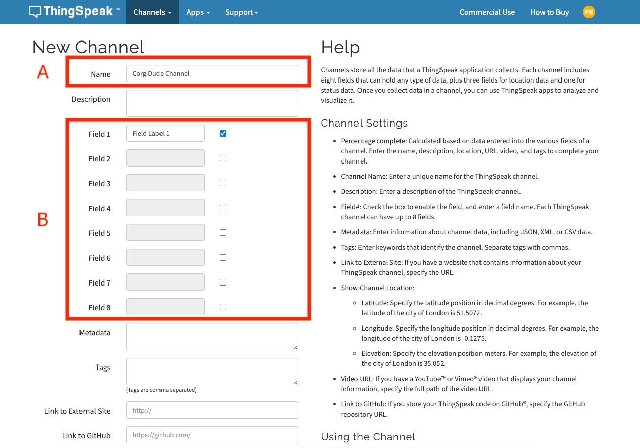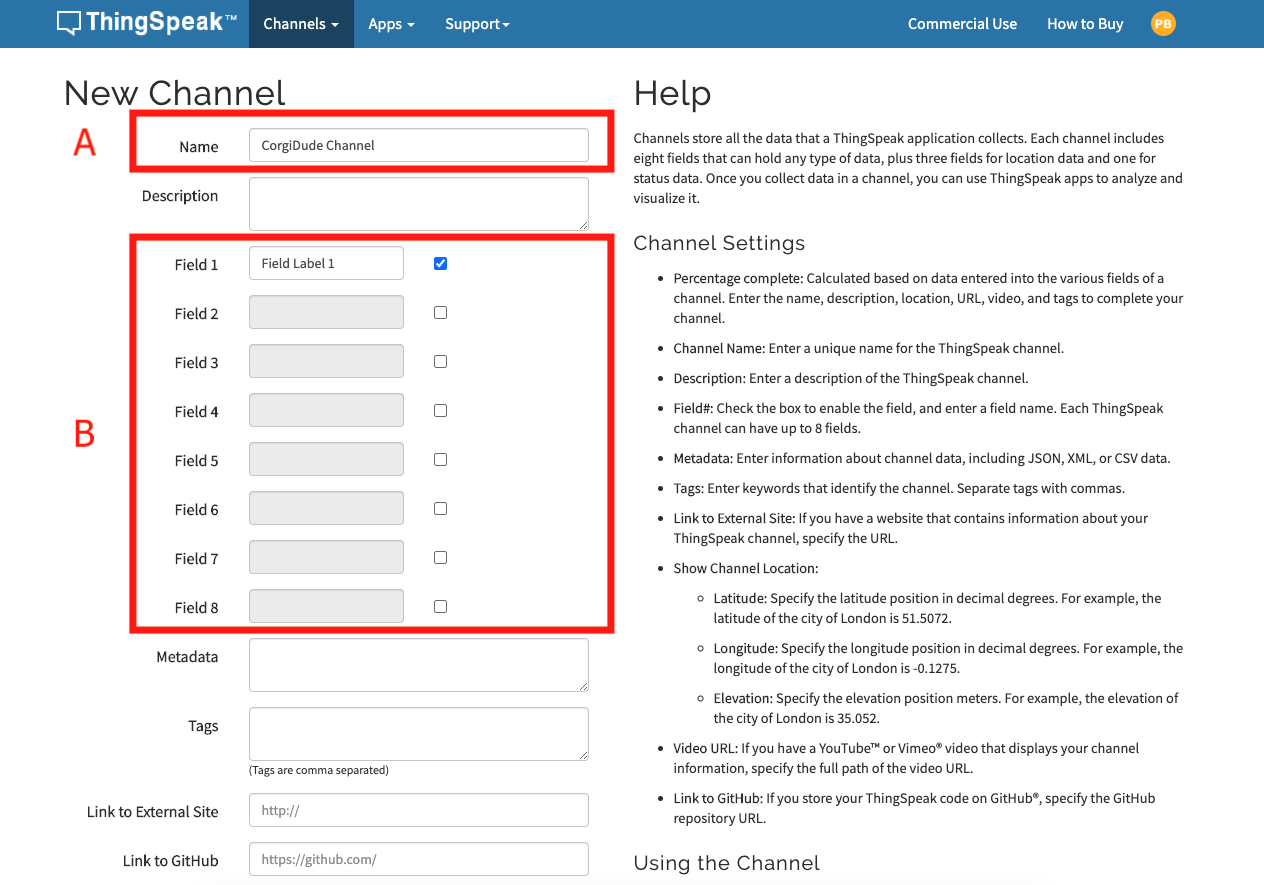 หลังจากนั้นเราจะพบกับหน้าแบบฟอร์มสร้าง Channel โดยในตัวอย่างภาพจะมี 2 ส่วนที่เป็นพื้นฐานตั้งค่า ซึ่งในส่วน A ให้เราทำการตั้งชื่อ Channel ที่เราจะใช้เก็บข้อมูล โดยในตัวอย่างตั้งชื่อว่า CorgiDude Channel และในส่วน B ให้เราติ๊กถูก Field ตามจำนวนที่ต้องการใช้งาน เช่น หากต้องการเก็บค่าอุณภูมิอากาศ ให้เก็บใน Field1 หากต้องการเก็บค่าความชื้นในอากาศให้แยกเก็บใน Field2 เป็นต้น