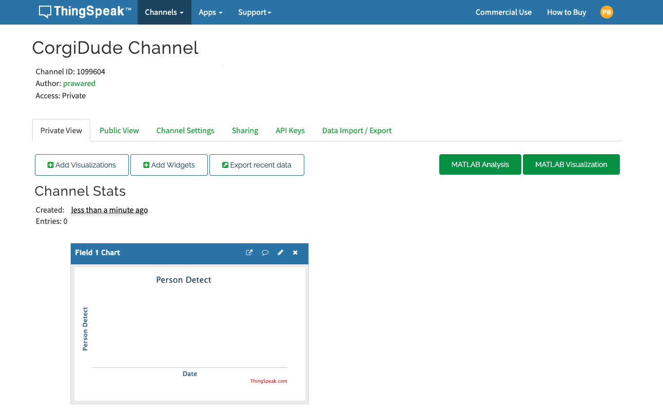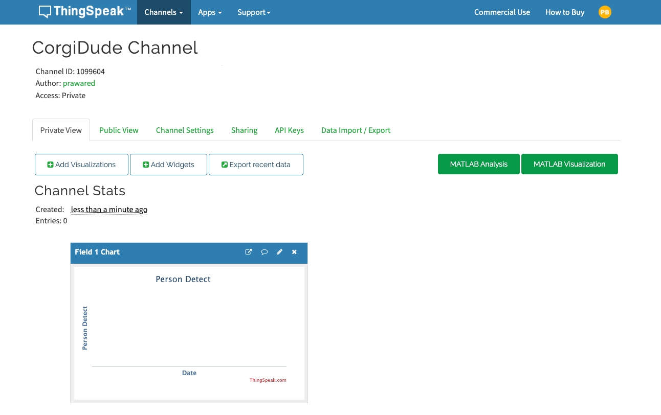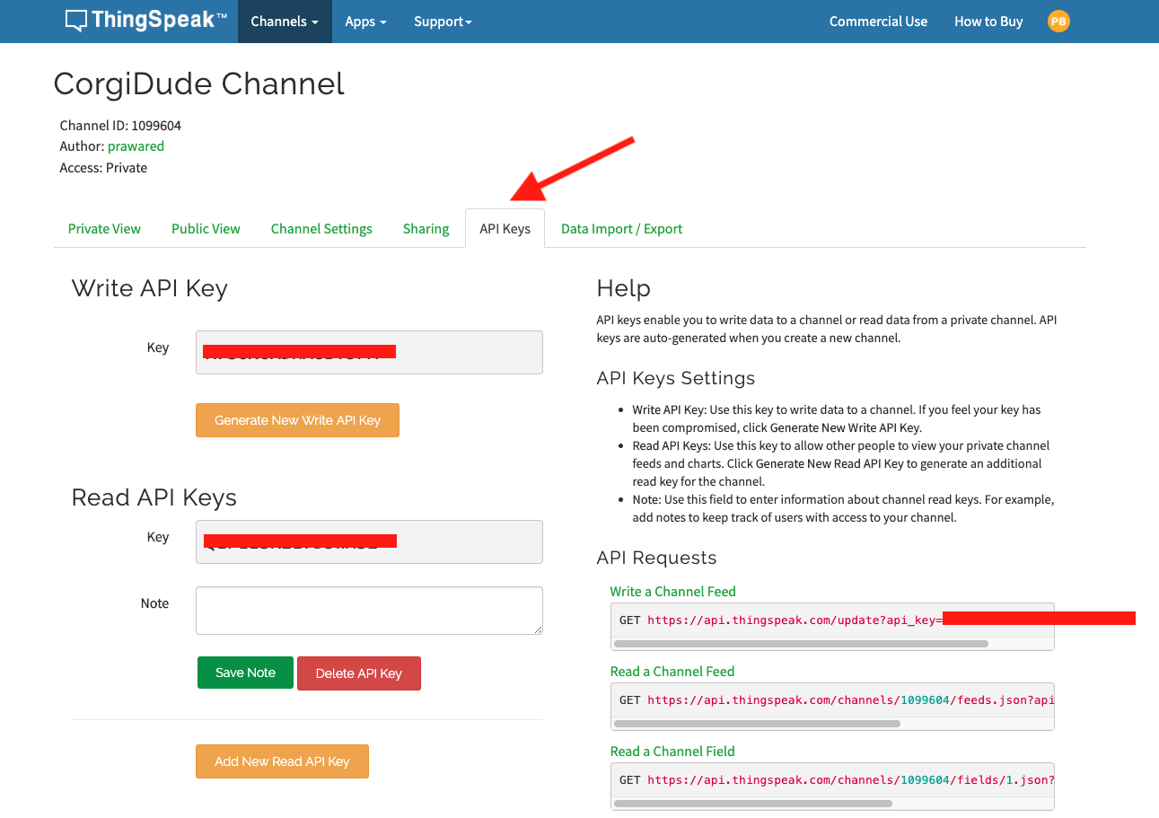หลังจากสร้าง Channel เรียบร้อยแล้ว เราจะพบกับหน้าเว็บดังตัวอย่างภาพ เพียงเท่านี้ก็พร้อมให้ CorgiDude ส่งข้อมูลมายัง ThingSpeak ได้แล้ว 🎉