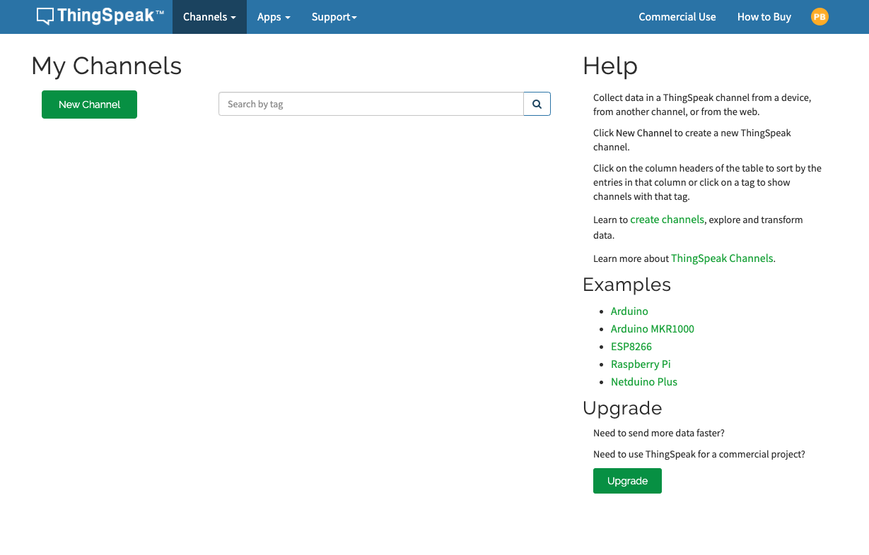 ให้ทำการล็อกอิน ThingSpeak ได้ที่ลิงก์ https://thingspeak.com/login หลังจากเข้ามาแล้ว เราจะพบกับหน้า Channel ว่างเปล่า (หากยังไม่เคยสร้าง Channel มาก่อนหน้า) โดยให้เราคลิกปุ่ม New Channel