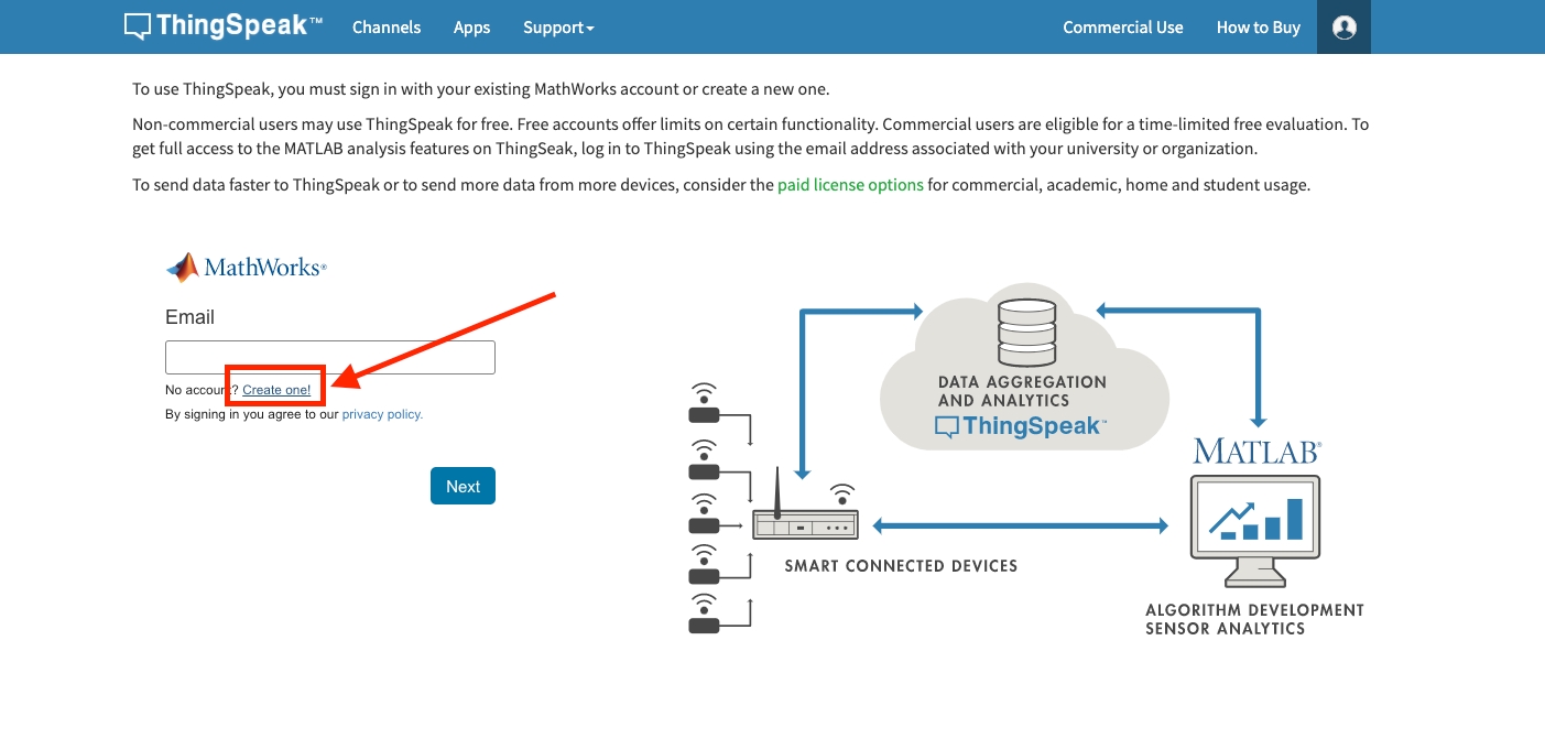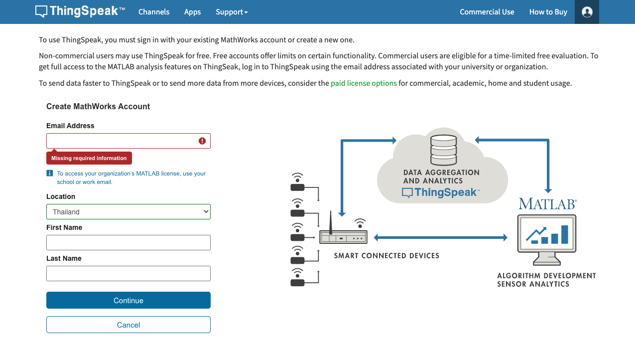 ขั้นตอนแรก ให้ทำการสมัครสมาชิกให้เรียบร้อยกันก่อนโดยเข้าไปที่ลิงก์ https://thingspeak.com/login